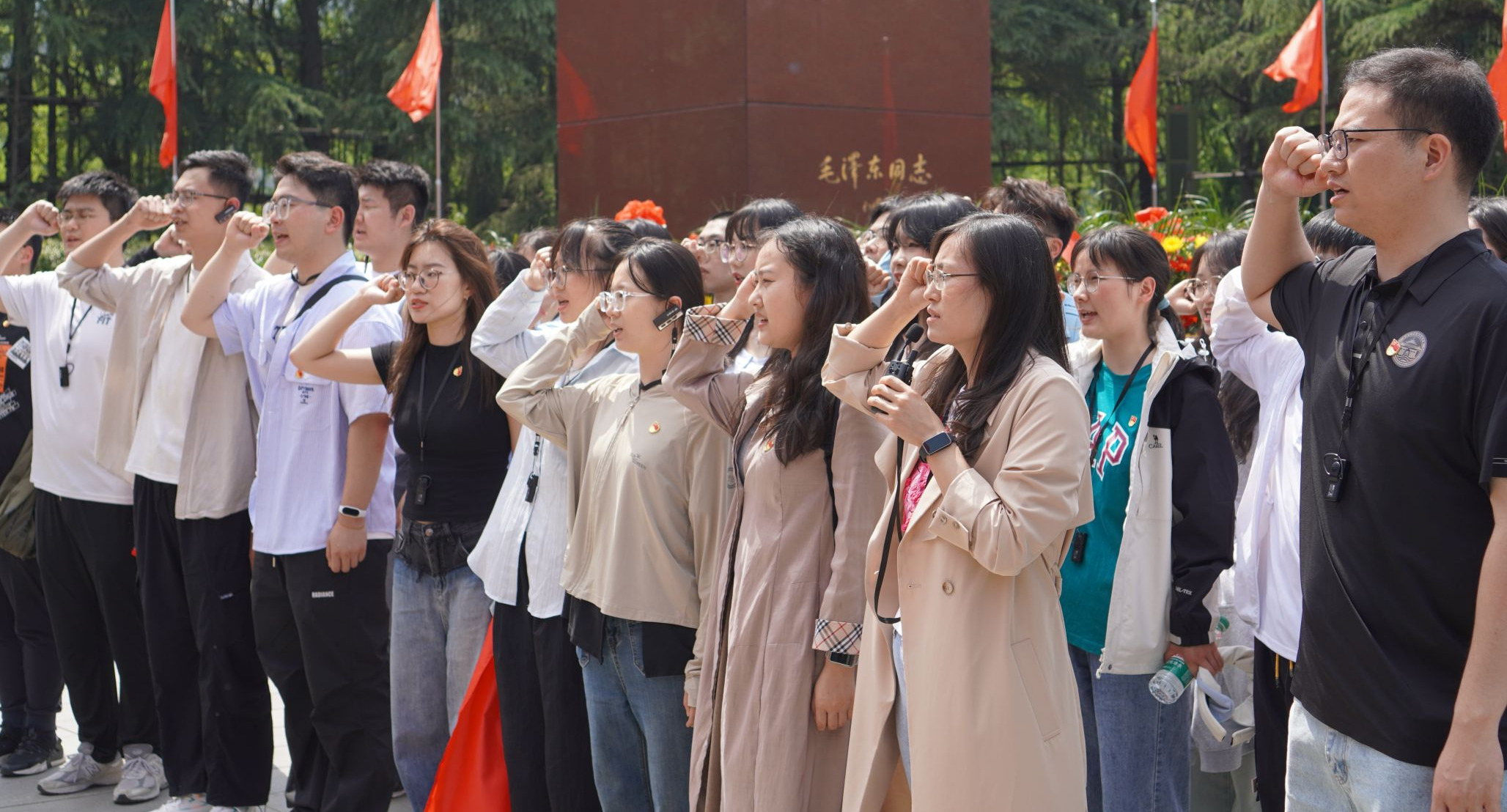 4月17日上午,同學們從學院出發(fā)抵達韶山,懷著無比崇敬的心情先后前往毛澤東廣場、毛澤東故居及毛澤東紀念館參觀學習。在毛澤東廣場,黨員們整齊列隊,向毛澤東同志銅像敬獻花籃并三鞠躬,表達對毛澤東同志的無限敬仰與深切緬懷。面對鮮艷的黨旗,左志香帶領全體黨員高舉右拳,重溫入黨誓詞,回顧入黨初心,接續(xù)砥礪奮斗。