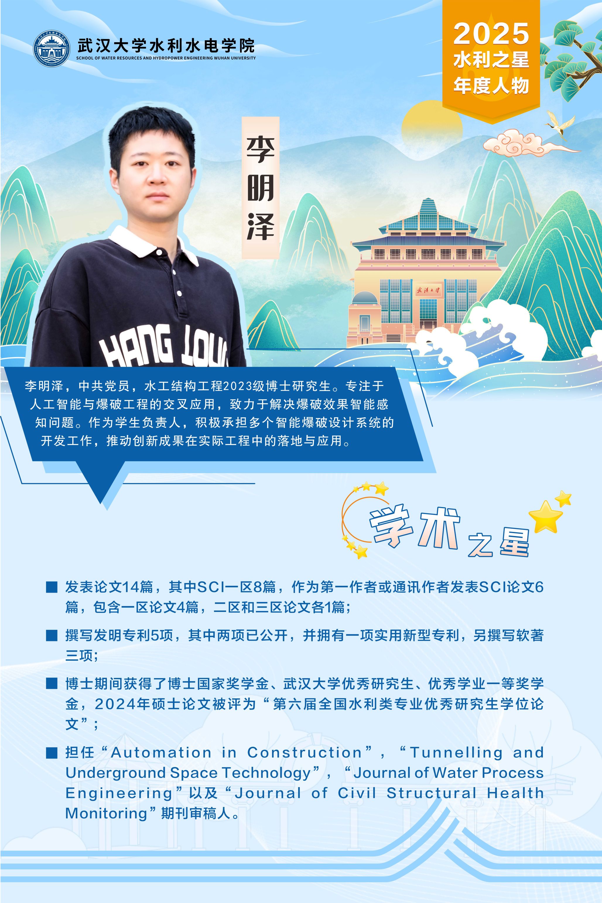 李明澤,中共黨員,水工結(jié)構(gòu)工程2023級(jí)博士研究生。他深耕智能破巖,致力破解爆破感知難題。以創(chuàng)新驅(qū)動(dòng)工程躍遷,以筆鋒書寫學(xué)術(shù)高度,更以慧眼審閱領(lǐng)域前沿,展現(xiàn)跨界融合的科研銳氣與全面發(fā)展的青年風(fēng)采。