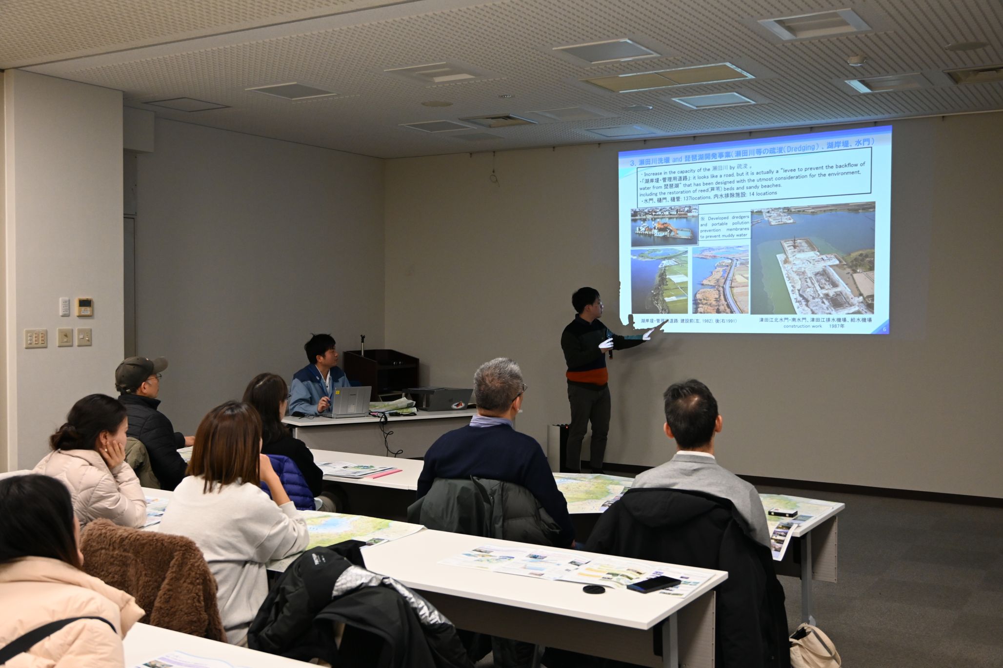 1月23日上午,實(shí)踐隊(duì)前往琵琶湖開(kāi)發(fā)綜合管理所,聽(tīng)取了所內(nèi)領(lǐng)導(dǎo)及工作人員關(guān)于琵琶湖治理的報(bào)告。前期實(shí)踐隊(duì)成員已了解了琵琶湖在防洪方面的舉措,今天進(jìn)一步學(xué)習(xí)了琵琶湖水資源管理方面的相關(guān)措施。工作人員從“治水”、“利水”、“環(huán)境”三個(gè)主題進(jìn)行講解,讓實(shí)踐隊(duì)員感受到只有在技術(shù)手段、規(guī)劃制度和公眾參與等方面形成合力,才能有效應(yīng)對(duì)水資源管理中的復(fù)雜問(wèn)題。此外,在介紹琵琶湖水資源調(diào)度時(shí),張小峰老師帶領(lǐng)同學(xué)們進(jìn)行了一個(gè)簡(jiǎn)單的計(jì)算,每年大致12億m3的琵琶湖蓄水需要供給日本關(guān)西地區(qū),這占琵琶湖總蓄水量的20%左右,在干旱情況下,保障供水是極具挑戰(zhàn)的。
