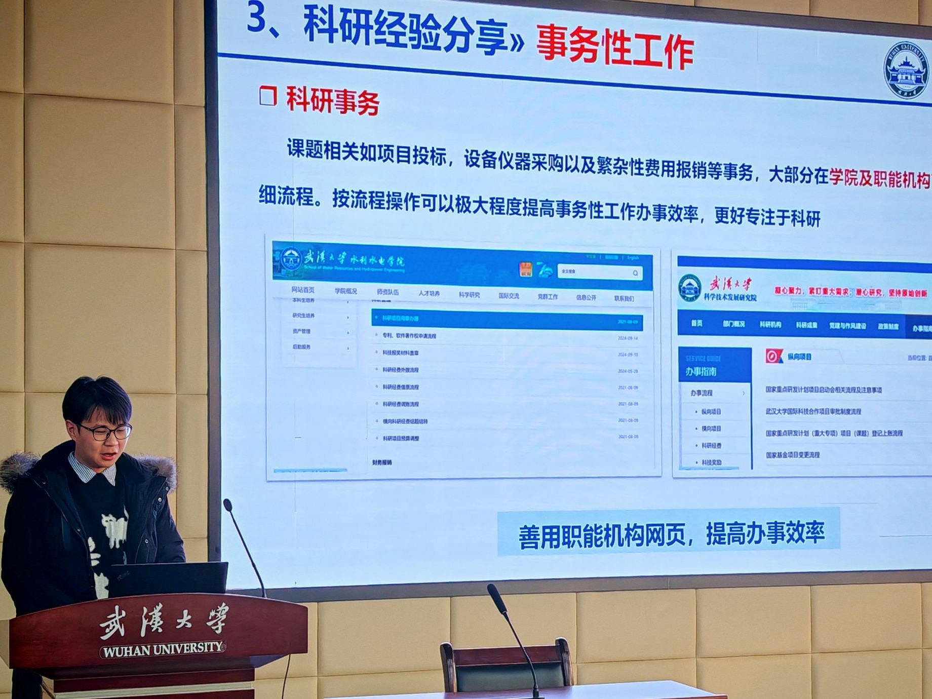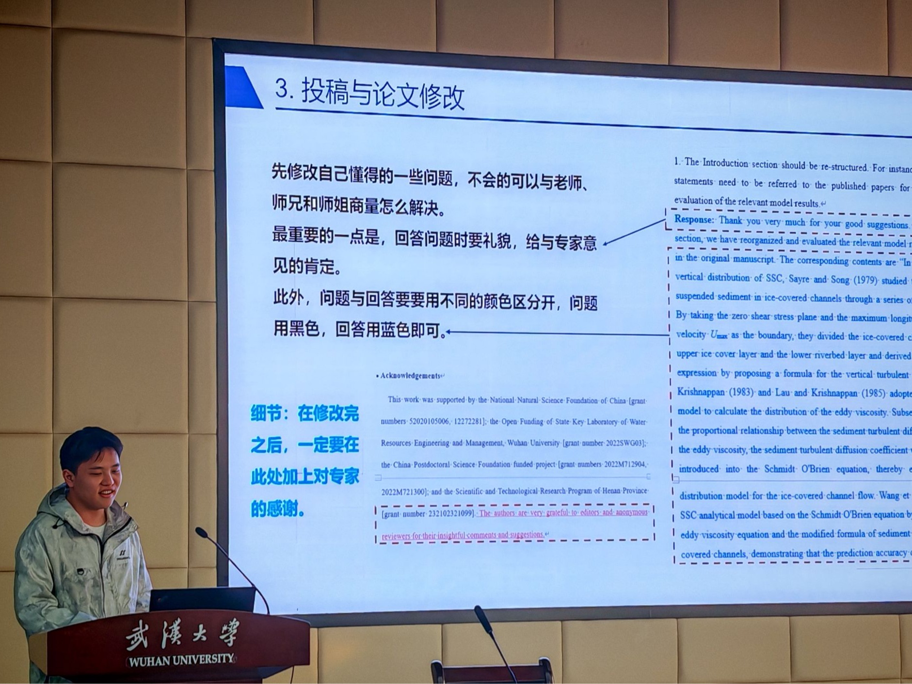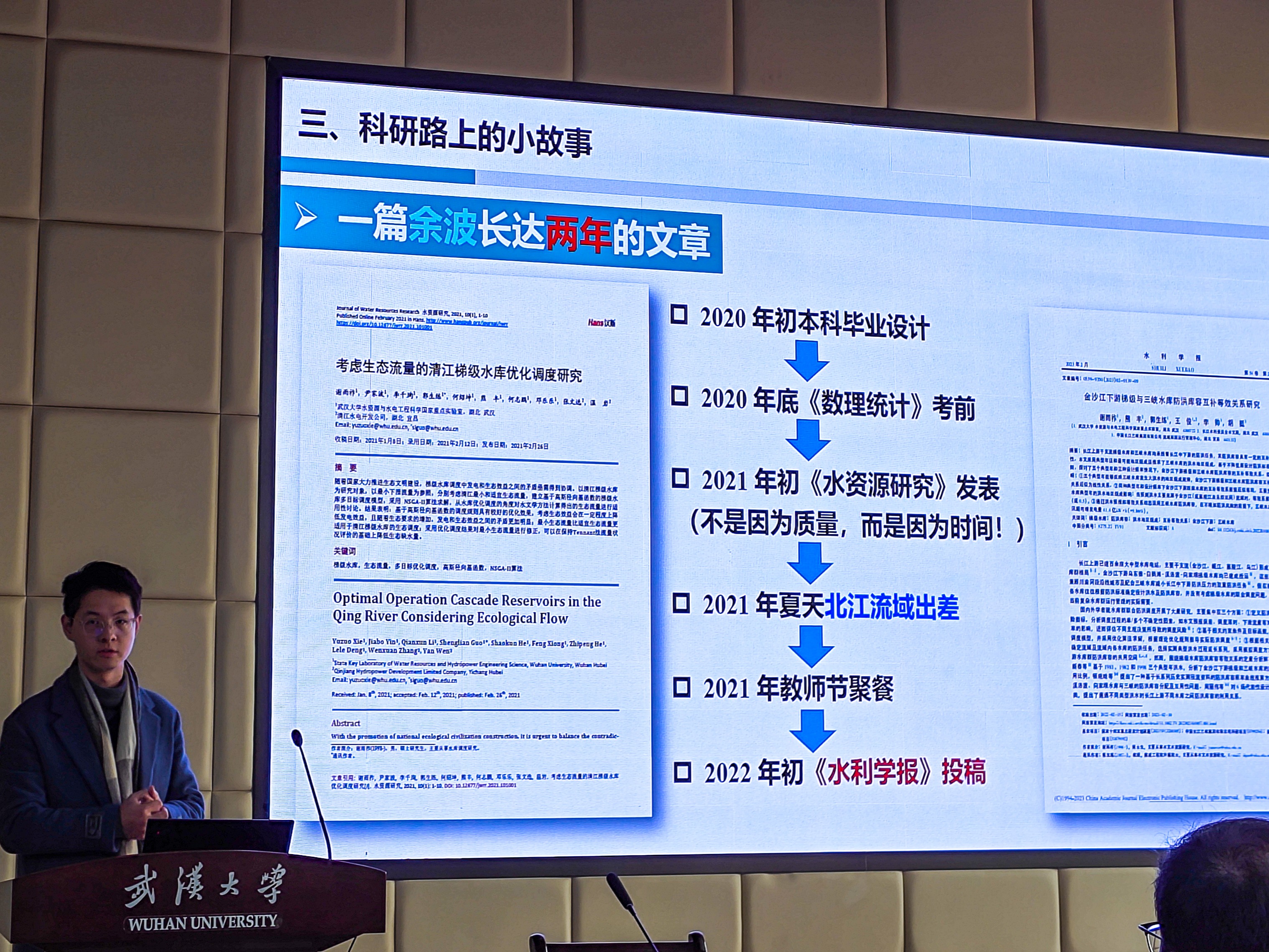 2024年12月18日-12月20日,由IAHR武漢大學(xué)學(xué)生分會主辦的兩場科研論文寫作經(jīng)驗(yàn)分享會在水利水電學(xué)院6401報(bào)告廳順利舉辦。此次活動共邀請到孫藍(lán)心等10位2023-2024學(xué)年研究生國家獎學(xué)金獲得者作為優(yōu)秀嘉賓,來分享科研寫作的經(jīng)驗(yàn)與心得。研究生輔導(dǎo)員陳曼雨、許笑星、萬柳柳老師出席本次活動。