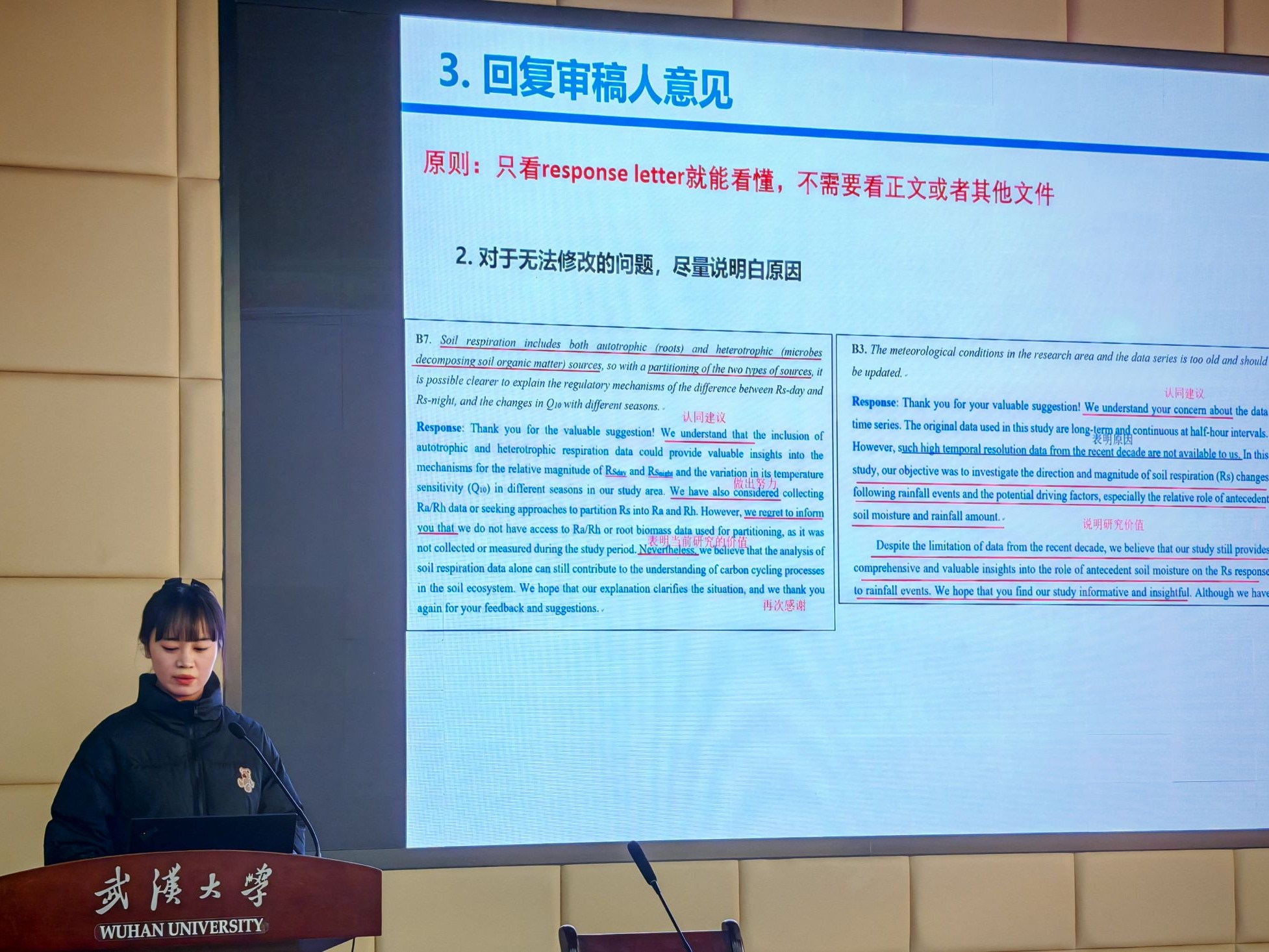 楊遠(yuǎn)航首先就論文idea、獲取學(xué)術(shù)資源、梳理文獻(xiàn)、論文寫作等內(nèi)容分享心得,建議同學(xué)們多結(jié)合當(dāng)前熱點(diǎn),依托課題組方向,關(guān)注領(lǐng)域類權(quán)威期刊、經(jīng)典文獻(xiàn),站在巨人的肩膀上進(jìn)行科研寫作;陳旭升分享了科研實(shí)驗(yàn)中的經(jīng)驗(yàn),實(shí)驗(yàn)裝置操作有疑惑時(shí),可請教設(shè)備工程師、課題組師兄或者校內(nèi)擁有同類儀器的課題組,積極報(bào)名校內(nèi)實(shí)驗(yàn)平臺培訓(xùn);韓亞靜詳細(xì)介紹了論文投稿過程中和審稿人的溝通技巧,要學(xué)會站在審稿人的角度思考提出的修改問題,即便不認(rèn)同也盡量委婉表達(dá),在科研和論文修改過程中多和導(dǎo)師溝通;李詩瓊表示論文寫作要注重構(gòu)思與框架,論文在投稿和返修的過程中要注重期刊的要求和模板,對目標(biāo)期刊審稿時(shí)間、出版時(shí)間、拒稿率等在前期有充分的調(diào)研,以合理規(guī)劃自己的科研時(shí)間;陳海亮表示文獻(xiàn)閱讀要注重量的積累和進(jìn)行系統(tǒng)總結(jié),并詳細(xì)介紹了論文投稿過程中的注意事項(xiàng),同時(shí)指出科研生活中要拒絕內(nèi)耗,主動面對挑戰(zhàn),做生活的主人。