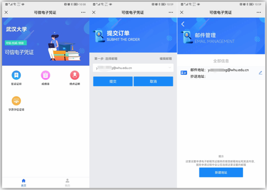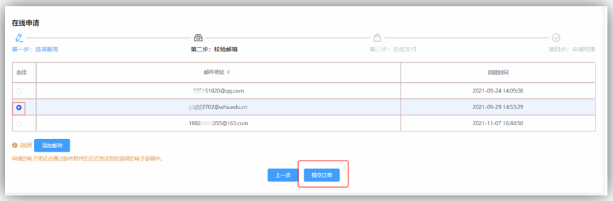 選擇需要發(fā)送的郵箱地址,核對郵箱地址,無誤則點擊“提交訂單”進入下一步操作,不對返回郵箱管理,修改為正確郵箱再重新申請。