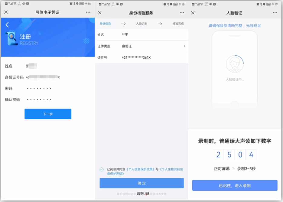 隨后系統(tǒng)將進行身份核驗,身份核驗成功后,即可使用注冊信息登錄可信電子憑證服務(wù)平臺。