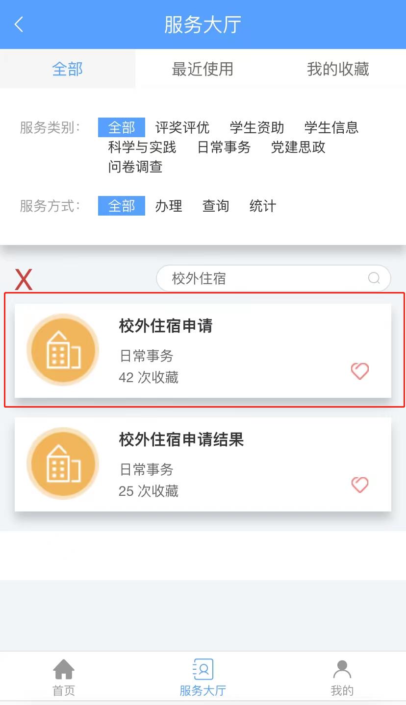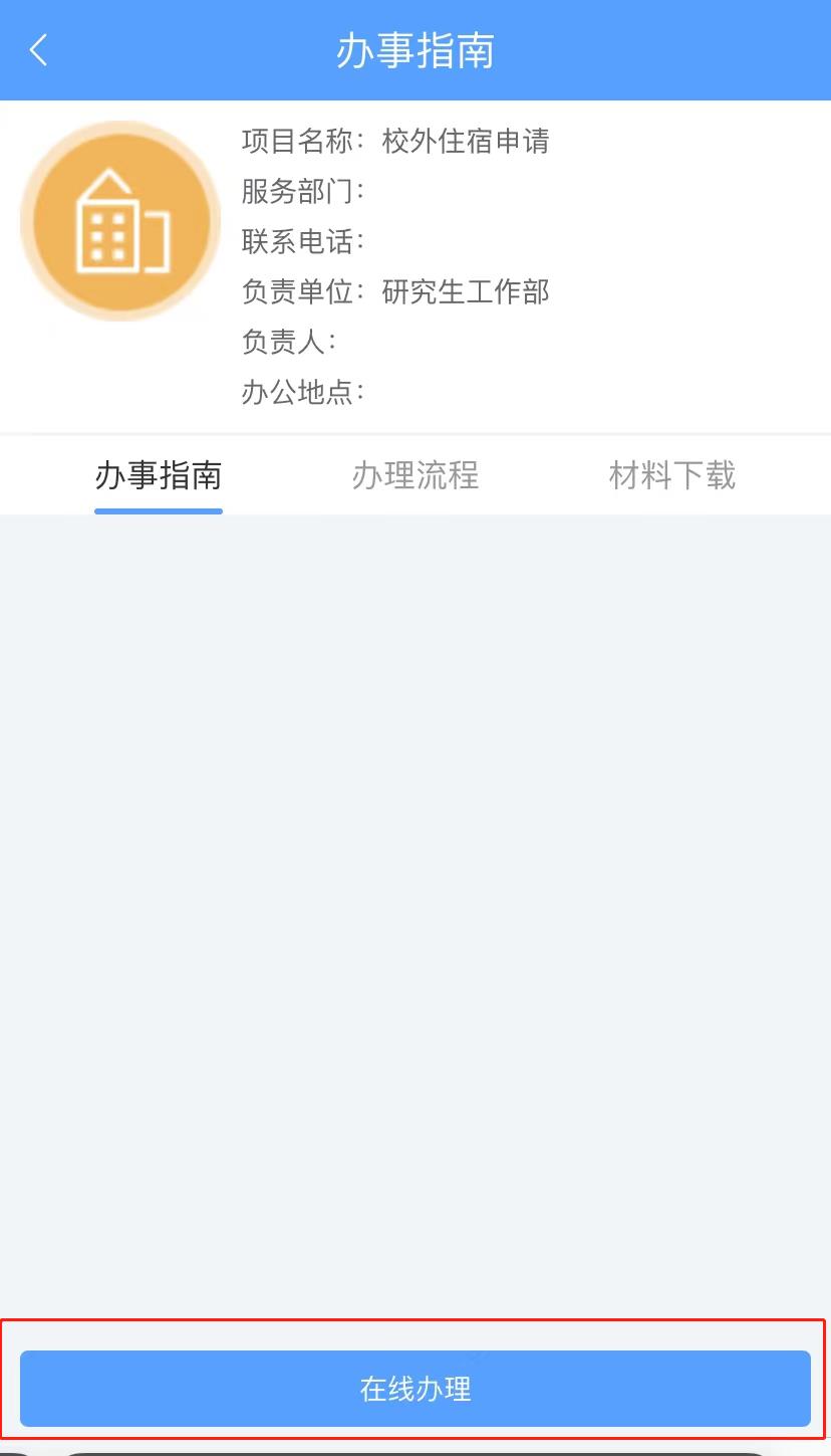 2.登錄“智慧珞珈App-智慧研工-服務大廳”,選擇“校外住宿申請”,點擊“在線辦理”。填寫好所有項目后點擊“提交申請”(注意,其中上傳附件處需上傳附件的掃描件)。