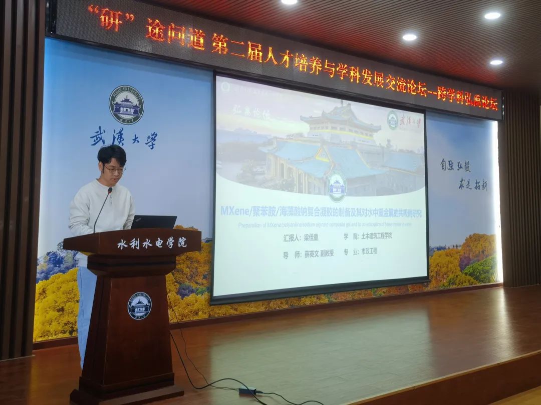 接下來,土木建筑工程學院碩士生梁佳童以《MXene/聚苯胺/海藻酸鈉復合凝膠的制備及其對水中重金屬的共吸附研究》為題進行學術報告。考慮到水體中的重金屬因其持久性和毒性,已對環(huán)境和人體健康構(gòu)成重大威脅這一現(xiàn)實情況,梁同學介紹了一種由他設計并合成的新型復合吸附材料,該材料具有穩(wěn)定且可再生的特性,不僅能在復雜水環(huán)境中表現(xiàn)出強大的吸附能力,同時還具備優(yōu)異的化學穩(wěn)定性和可循環(huán)使用的特性,大幅提升了重金屬去除效率。他的研究為解決水體重金屬污染提供了新的技術途徑,展現(xiàn)了高效、可持續(xù)的吸附材料在環(huán)境保護中的應用潛力,具有重要的環(huán)境意義和應用前景。