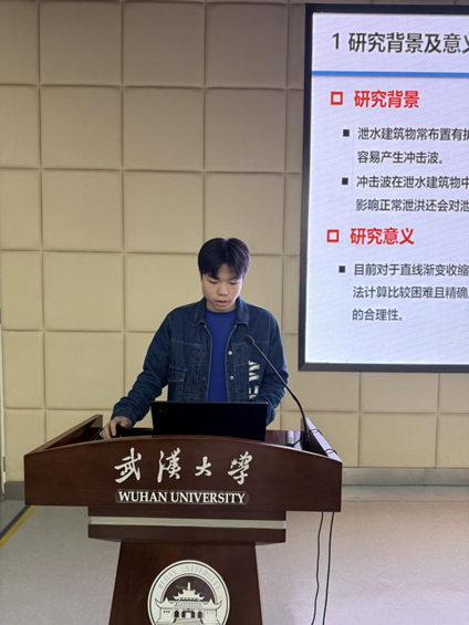 尹才銘以《弧形收縮段急流沖擊波水力特性及體型優(yōu)化研究》為題進(jìn)行學(xué)術(shù)報(bào)告。弧形收縮段溢洪道因急流沖擊波易導(dǎo)致泄槽水深超邊墻設(shè)計(jì)值,嚴(yán)重威脅泄洪安全,尹同學(xué)圍繞這一問題展開研究。他以實(shí)際工程為依托,通過數(shù)值模擬探究收縮角、上游水位對(duì)沖擊波的影響,設(shè)計(jì)多組方案,并結(jié)合1:60物理模型試驗(yàn)驗(yàn)證。研究發(fā)現(xiàn),收縮角、水位與沖擊波強(qiáng)度呈正相關(guān),原24°收縮角在最大可能洪水(PMF)下超邊墻高度。最終推薦將收縮角優(yōu)化為18°,該方案下PMF工況兩側(cè)邊墻最大水深分別為均低于設(shè)計(jì)值,有效削減沖擊波影響,讓泄槽水深分布更均勻,提升了泄洪安全裕度。