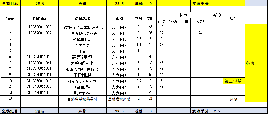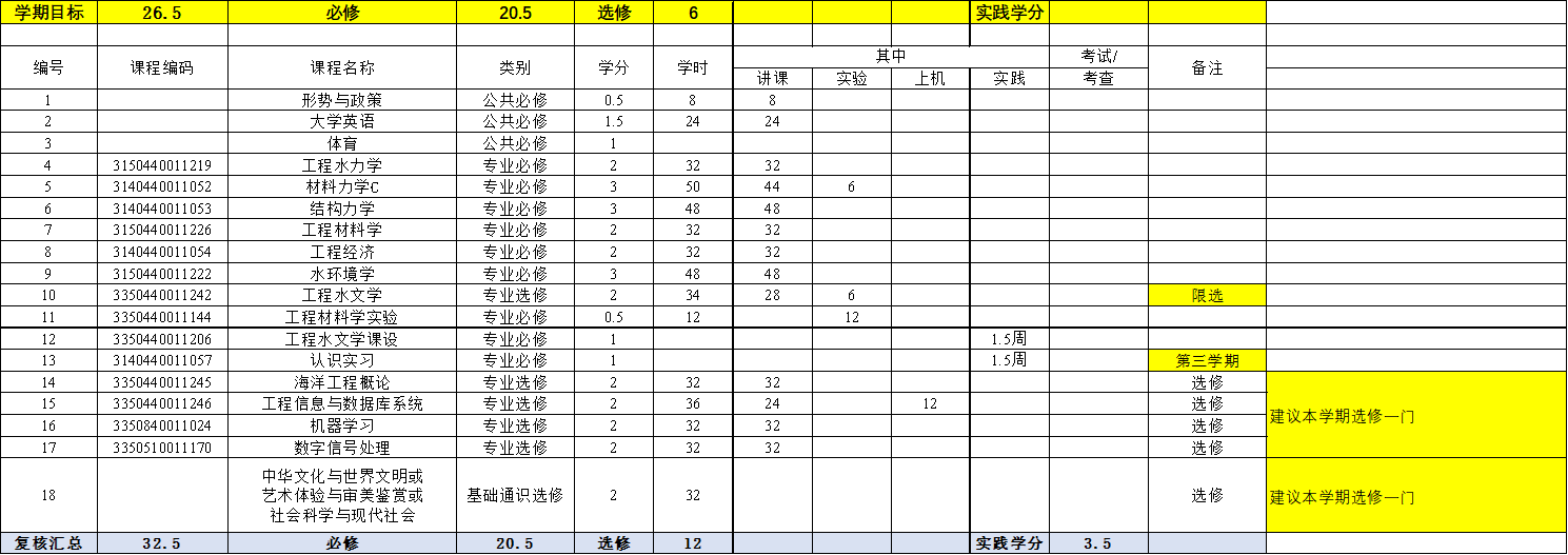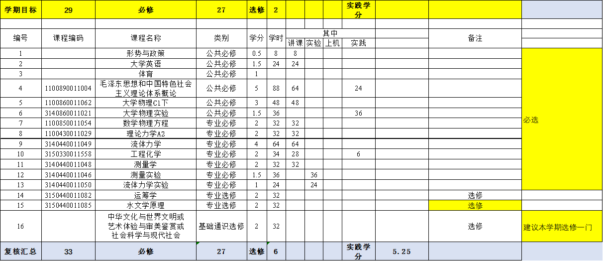 本專業(yè)的培養(yǎng)方案是按水利大類培養(yǎng)方案制定的,由于必修課程和選修課程比例的限制,部分工程教育認(rèn)證標(biāo)準(zhǔn)中要求的課程被列入選修課或并入其它課程。為了保證對本專業(yè)所有學(xué)生相關(guān)基本專業(yè)能力培養(yǎng)不會帶來不確定性,對本專業(yè)學(xué)生的選課做出了如下指導(dǎo)性意見: